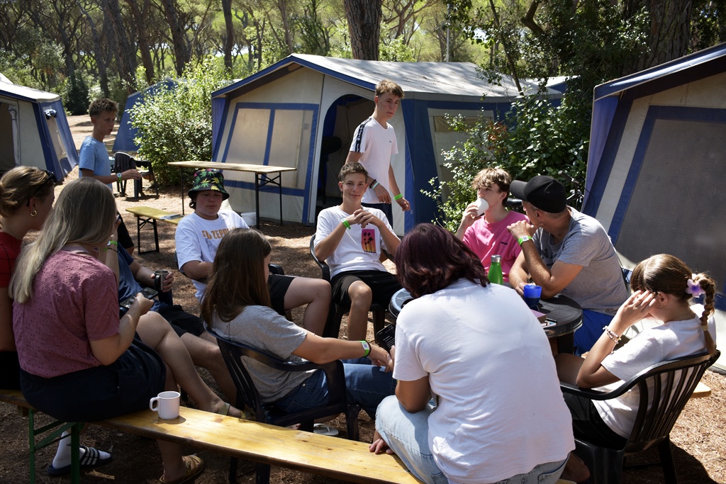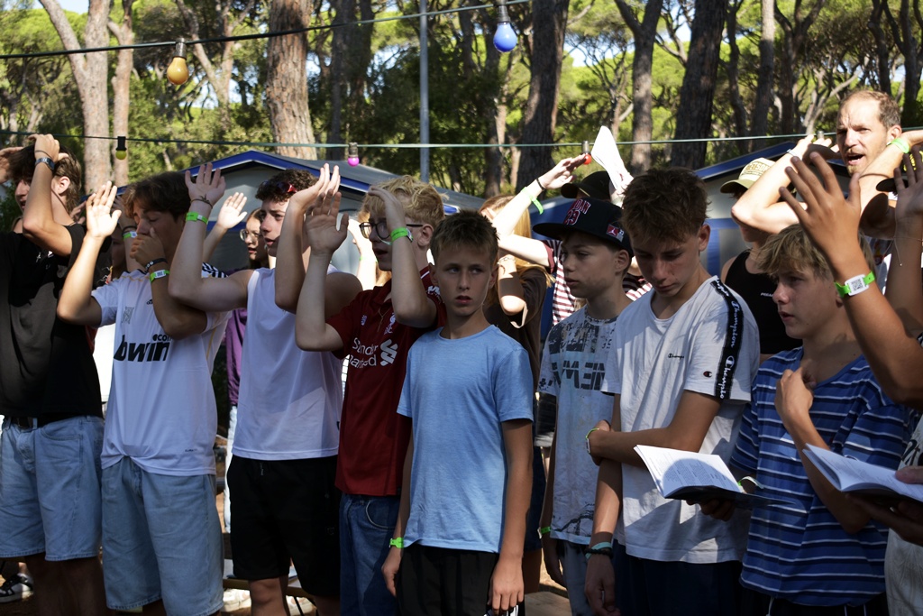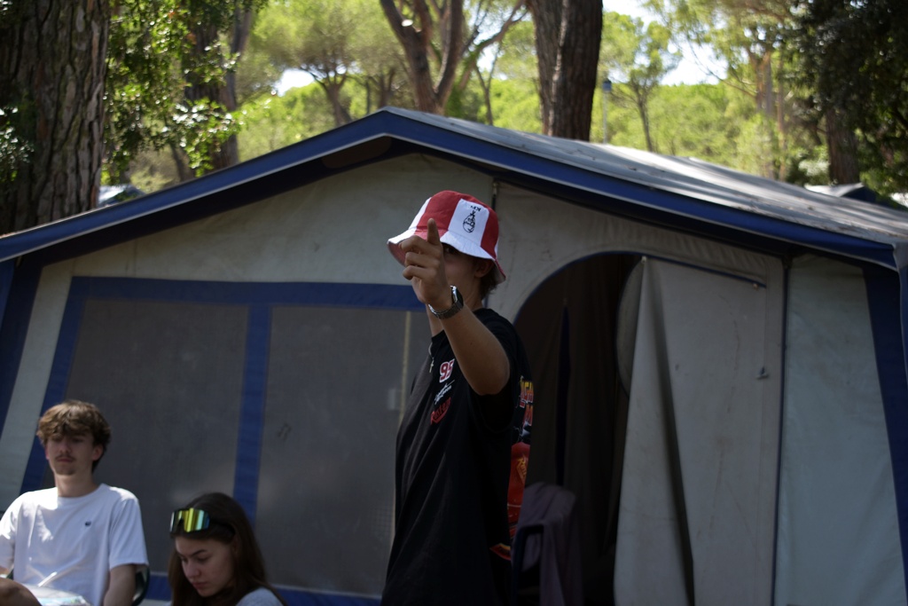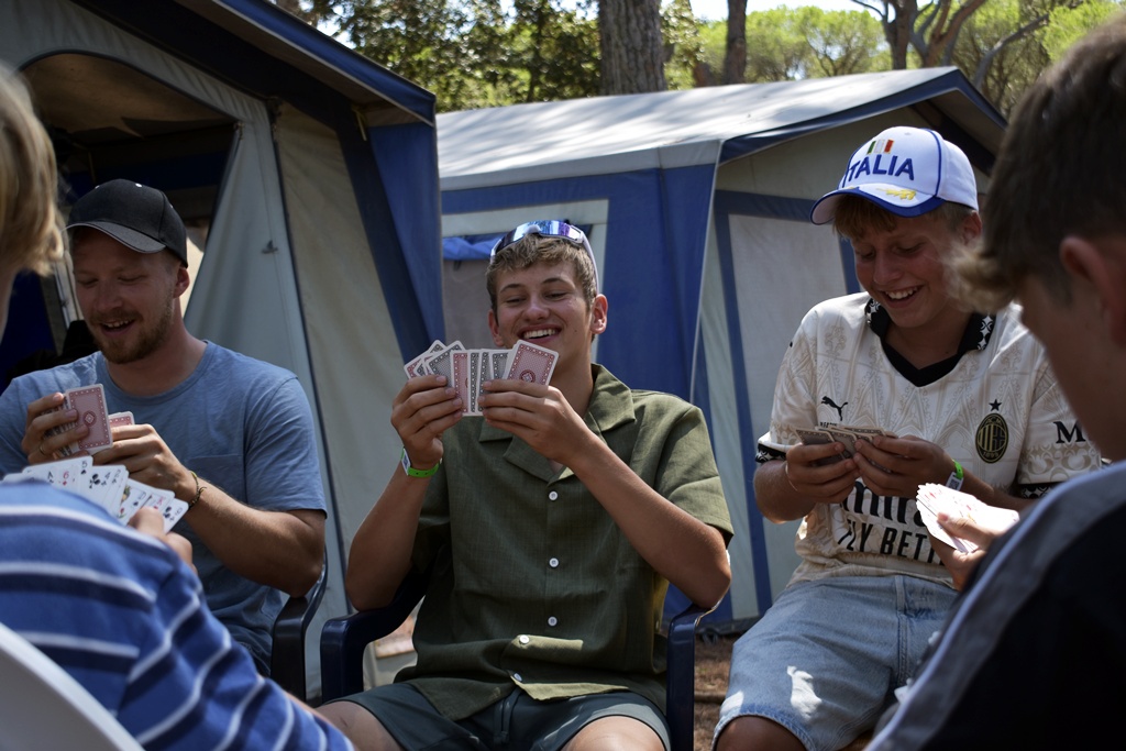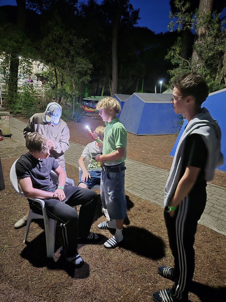 Nach einem deftigen Abendessen und einer Dusche später, um nach all dem Sport und Meersalz wieder frisch zu werden, starteten wir mit dem Abendprogramm. Heute gaben wir beim Singen so richtig Gas und bestimmt konnten da einige Jungscharklassiker über einen großen Teil des Campingplatzes gehört werden! Ebenso lockerten wir die Stimmung noch mit einem kleinen Spiel auf.